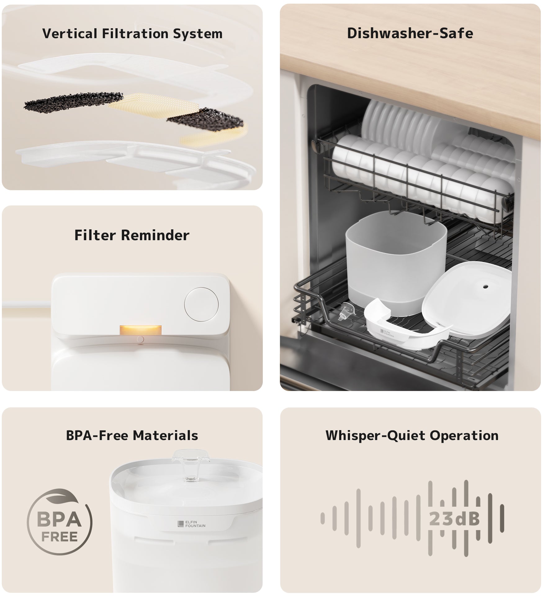 A continuous flow keeps water circulating around the clock, enticing pets to drink more, even when you're away.
