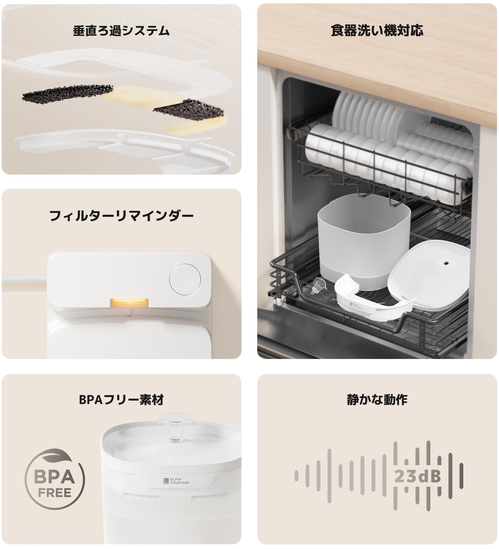 この革新的な構造により、静音性が向上し、清掃も簡単になり、さらに飲み水の安全性も高めています。水の循環方法を根本から見直すことで、ポンプによる水流やろ過といったメリットはそのままに、従来の複雑さをなくすことに成功しました。