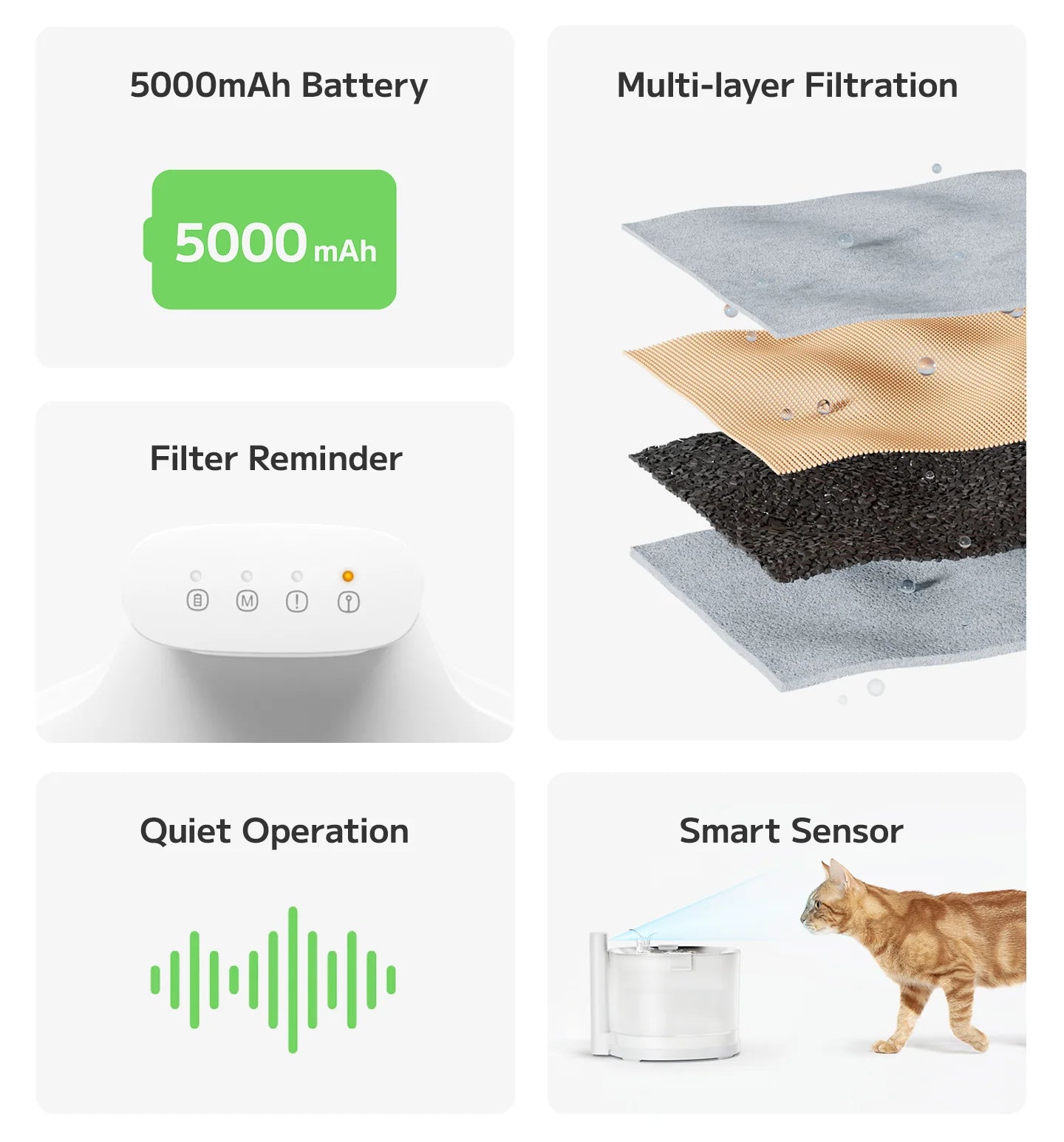この革新的な構造により、静音性が向上し、清掃も簡単になり、さらに飲み水の安全性も高めています。水の循環方法を根本から見直すことで、ポンプによる水流やろ過といったメリットはそのままに、従来の複雑さをなくすことに成功しました。