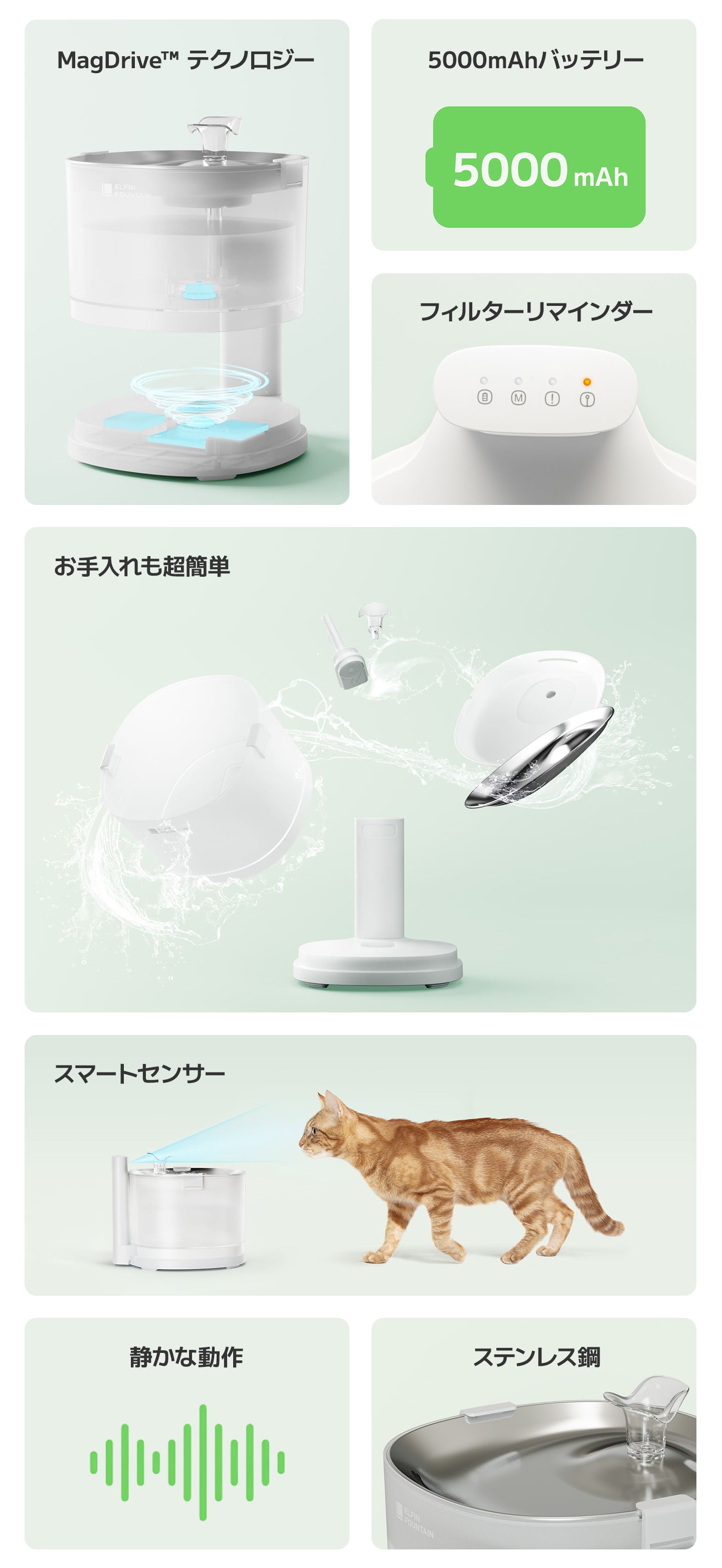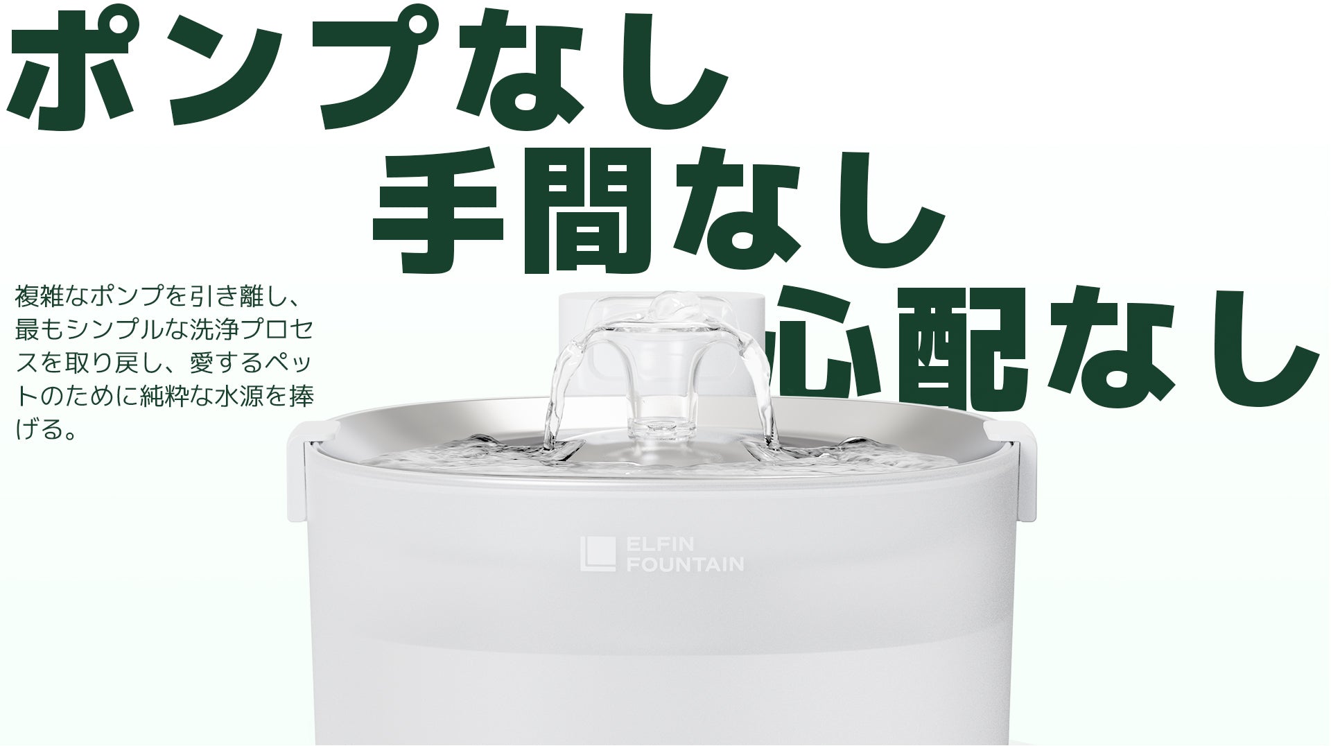 MagDrive™ テクノロジーを搭載したエルフィン給水器は、有線か無線かを問わず、従来の水ポンプとは異なり、ポンプなしで操作できます。