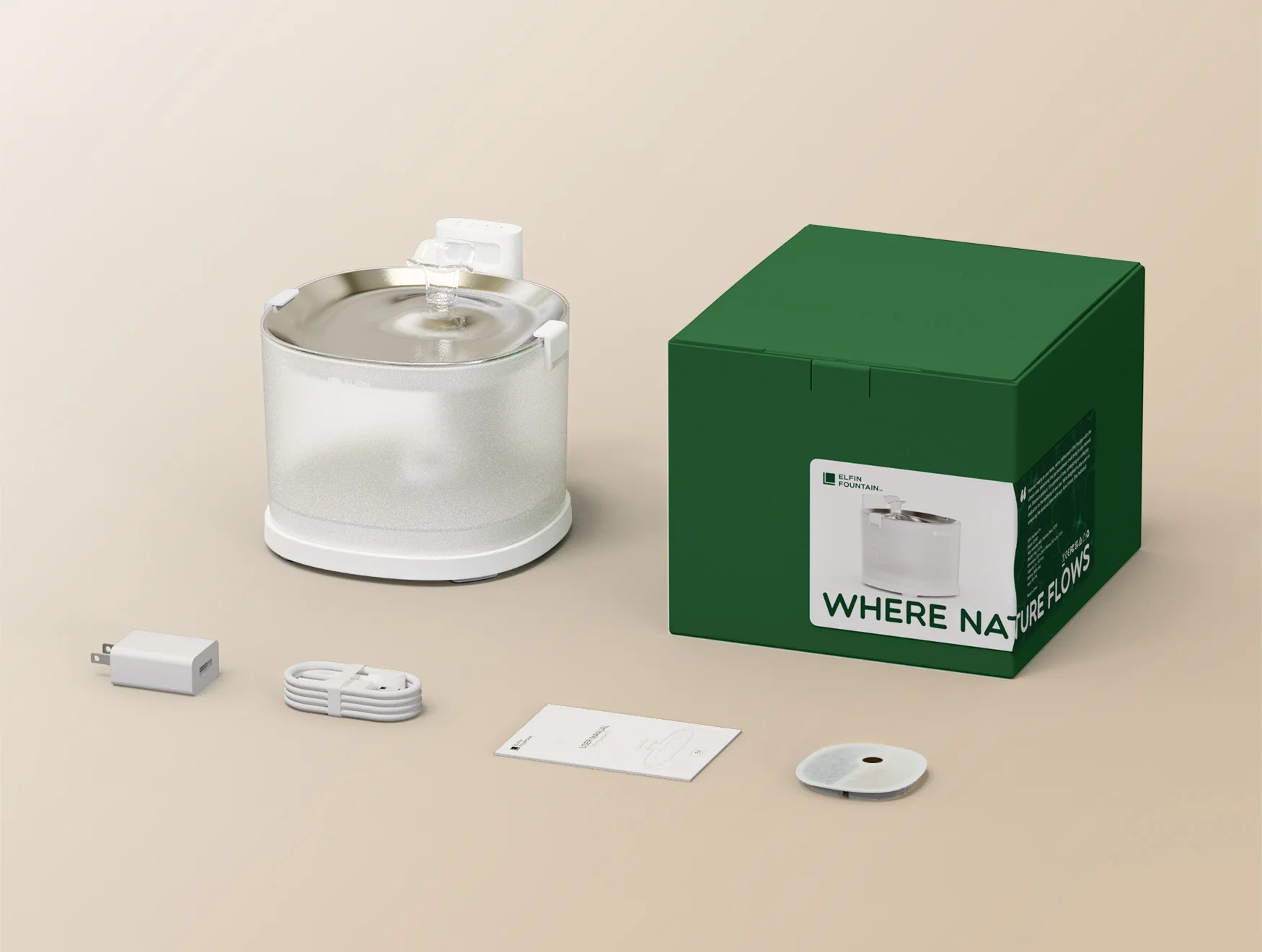 We recommend cleaning the Elfin Fountain once a week. However, cleaning the Elfin Fountain is not like a chore. All you need to do is take the water tank away from the base, disassemble the parts (the water tray, the tank, the conduit, and the impeller), and rinse and scrub them to clean. It's as easy as a breath, and there's no pump to worry about!